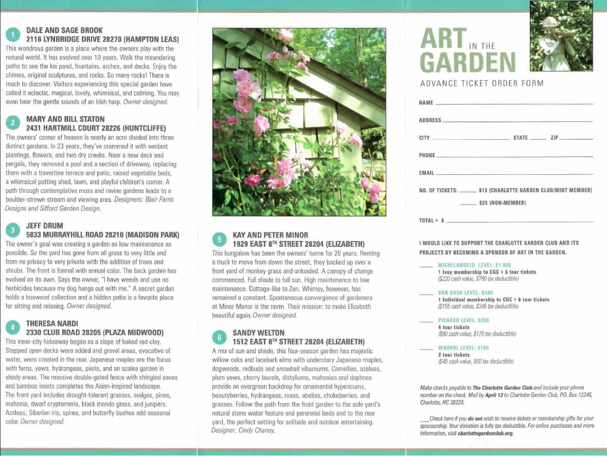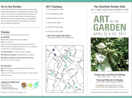 Art in the Garden The 2017 Art in the Garden Tour May 1, 2017 February 22, 2026 The 2017 Tour Brochure Click an Image to View Full Size Brochure, Page 1 Brochure, Page 2 2015-2016 Program Schedule 2016-2017 Program Schedule