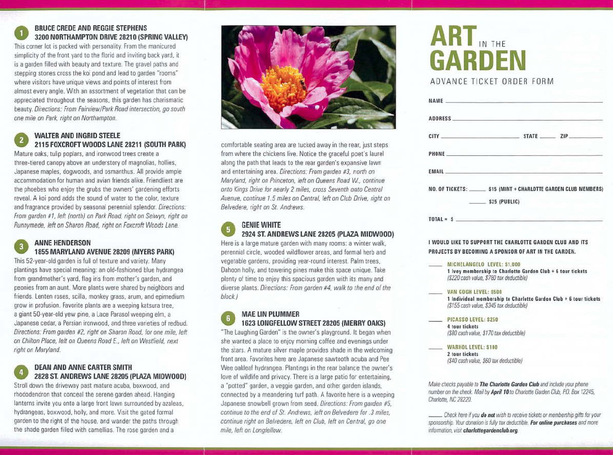 Art in the Garden The 2018 Art in the Garden Tour May 1, 2018 February 22, 2026 The 2018 Tour Brochure Click an Image to View Full Size Brochure, Page 1 Brochure, Page 2 2016-2017 Program Schedule 2017-2018 Program Schedule